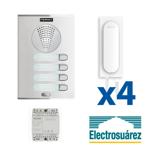 Los kits de portero para edificios incluyen todo el material necesario para una instalación completa y un funcionamiento inmediato: placa de calle y caja de empotrar, alimentador DIN 12Vac/1A (ref.4802) y 4 teléfonos.